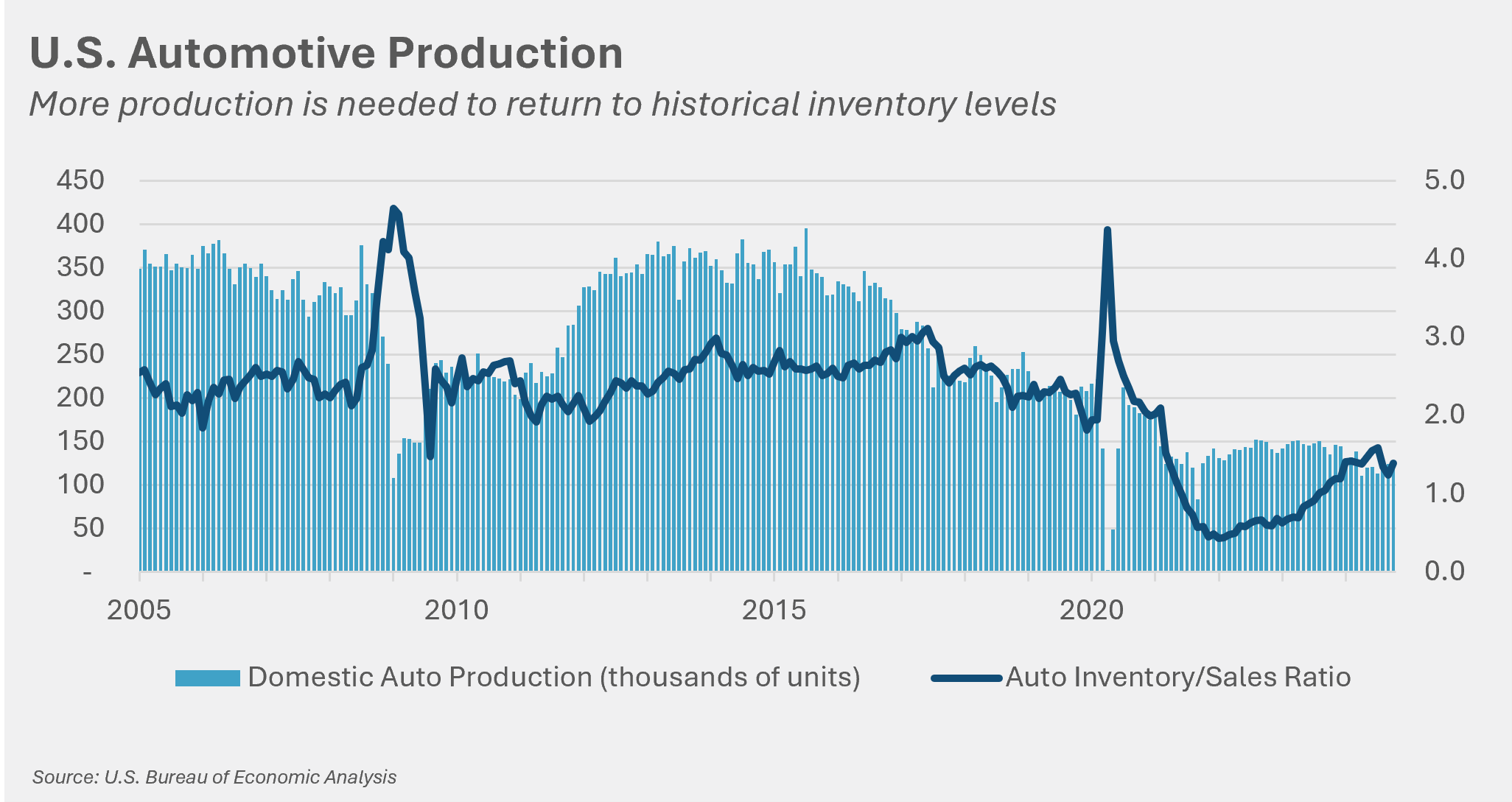 In the years following the pandemic, supply chains became strained. OEMs found that in their pursuit of the lowest possible cost, they had inadvertently assumed increased supply chain risk. Those risks became reality as lead times tripled and, in some instances, production lines were forced to shut down. As a result, many OEMs refocused sourcing efforts to prioritize domestic suppliers. This not only decreased shipping times but also reduced exposure to freight costs and port closures. Momentum shifting back to the U.S. is already underway, and policy may accelerate the trend as the threat of tariffs will continue to incentivize U.S. production. The Inflation Reduction Act (IRA), Creating Helpful Incentives to Produce Semiconductors (CHIPS) Act and the Infrastructure Investment and Jobs Act (IIJA) have driven a boom in factory construction in recent years, and the U.S. manufacturing sector is poised to capitalize on these shifting trends.
