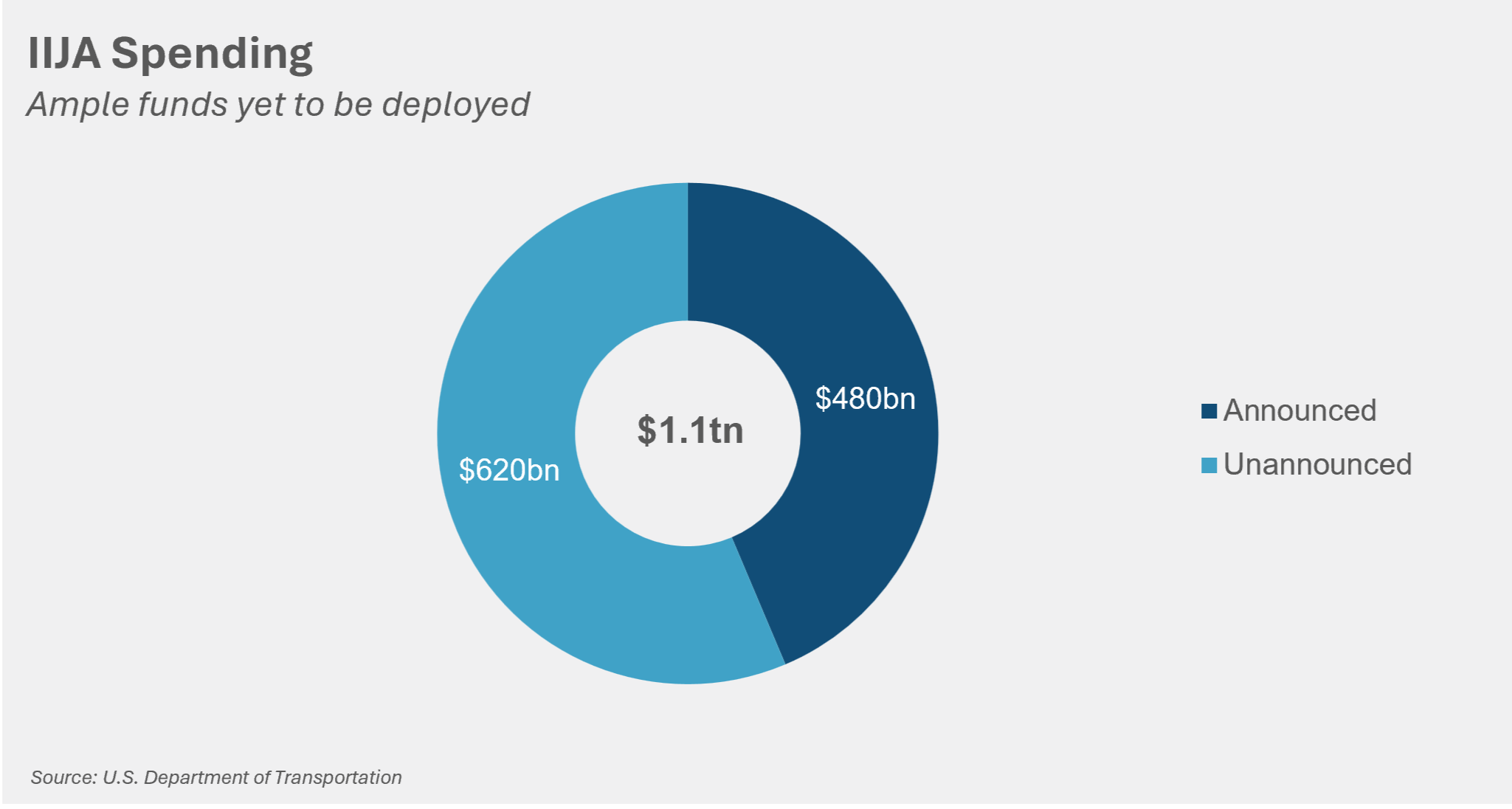 Several large legislative bills were passed in recent years, each designed to strengthen U.S. infrastructure, industrial capacity, and economic competitiveness. In particular, the Infrastructure Investment and Jobs Act (IIJA) authorized $1.2 trillion in transportation and infrastructure spending. The bill is wide reaching and many of the projects (bridges, buses, airports, energy projects) will drive fastener consumption throughout the U.S. As of September 2024, less than half of funding had been announced and even less had been spent. Domestic sourcing requirements have contributed to the slow deployment, as has decreased purchasing power due to inflation. “Use it or Lose it” stipulations should accelerate spending in the final years of the bill, and “Buy American” requirements should benefit U.S.-based fastener manufacturers and their related distributors.